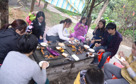 烧烤现场热闹非凡 , , ,,,各人配合默契 , , ,,,有的穿串、有的烤制 , , ,,,烧烤配料和零食富厚多样 , , ,,,各人在一片欢声笑语中配合品尝美食。。。。。